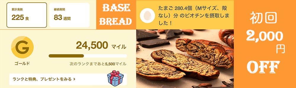 さらにBASE BREADにはたくさんの栄養素が含まれています。一番好きなレーズンパンで1袋あたり鉄分 2.0g、たんぱく質 13.5g、食物繊維 3g、チアシード由来のオメガ3脂肪酸 0.5gで、からだに必要な26種のビタミン・ミネラルも入ってます・・!気になる糖質については一般的なパンと比較して約20%オフなのもうれしいですね。